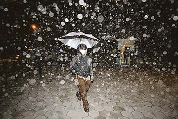 penduduk menggunakan payung bagi mengelakkan debu gunung berapi |